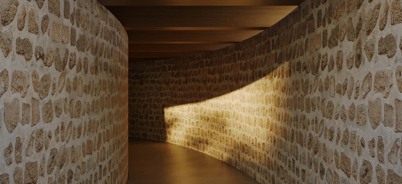 A rampa, além de promenade para se chegar ao templo, também serve como espaço de tansição – seja através da luz, que diminui potencialmente, como também o ‘’entrar na terra’’ que, simbolicamente, pode representar uma entrada em outro estado de espírito. A luz, por sua vez, nasce majoritariamente de uma única abertura e aterrisa no altar, dando foco ao pequeno lago e água que desce do muro. Como numa cascata, a natureza é enquadrada.