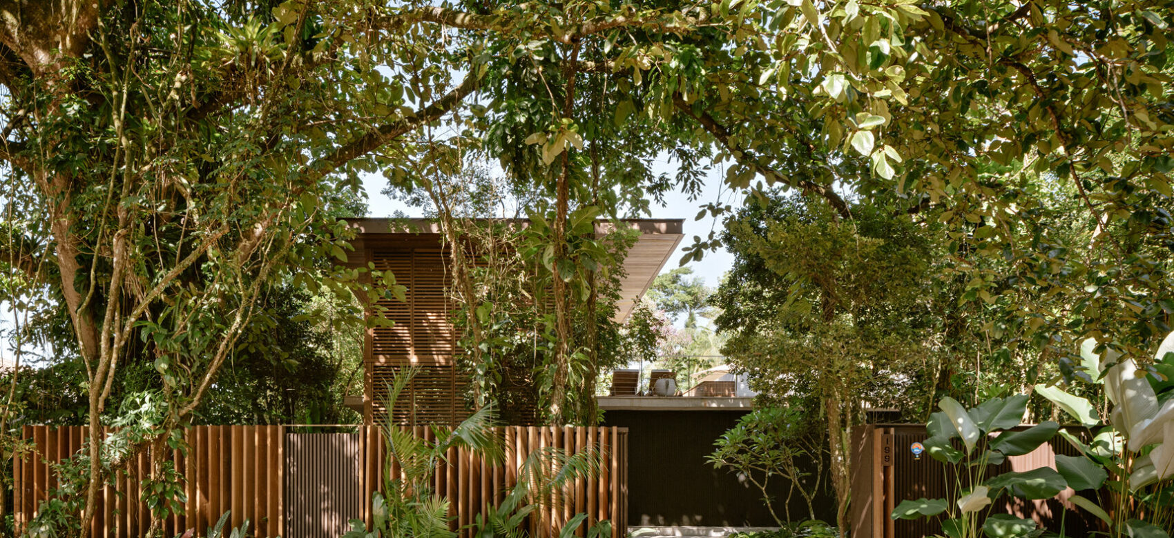 Inserida na mata atlântica, a Residência Itamambuca II surge de forma silenciosa na paisagem. A vegetação densa envolve a construção, garantindo privacidade e reforçando a conexão com o entorno.