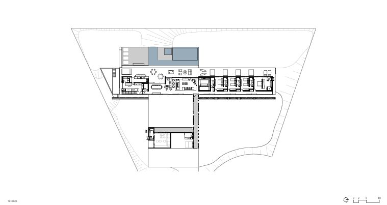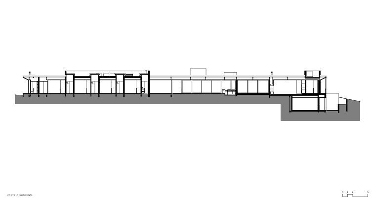 Localizada em um terreno bastante esguio, ergue-se um volume linear aberto para o campo de golfe e um pôr do sol singular. Servindo como um anteparo contra o fluxo de moradores que se direcionam para esse campo e auxiliando na manutenção da privacidade dos filhos do casal, um segundo corpo em concreto aparente é descolado do volume principal e posicionado à frente dele. Esse pavilhão configura, sobretudo, um pátio e a promenade entre os blocos.