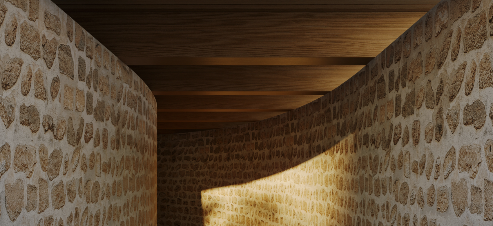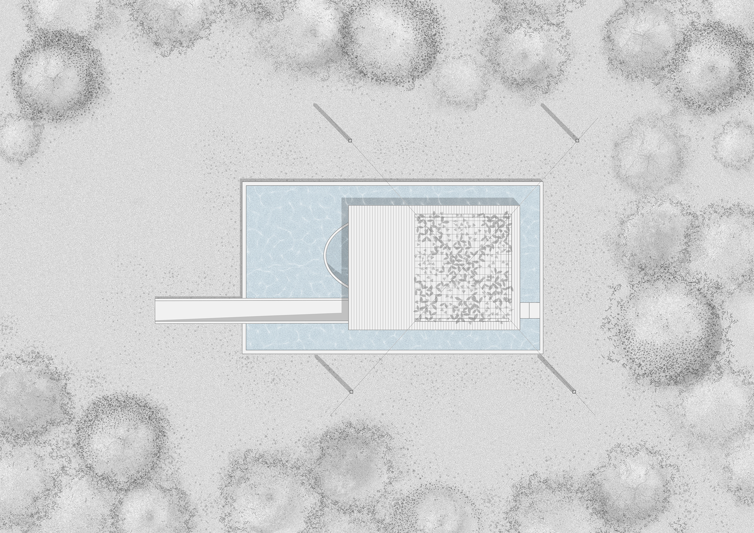 Imperceptível a uma primeira instância, esse delicado projeto para uma capela parte de uma volumetria em negativo. Isso é, um vazio no chão que, sob uma cobertura, proporciona um espaço intimista, com uma luz pontual que gradativamente ilumina o espaço como um todo.